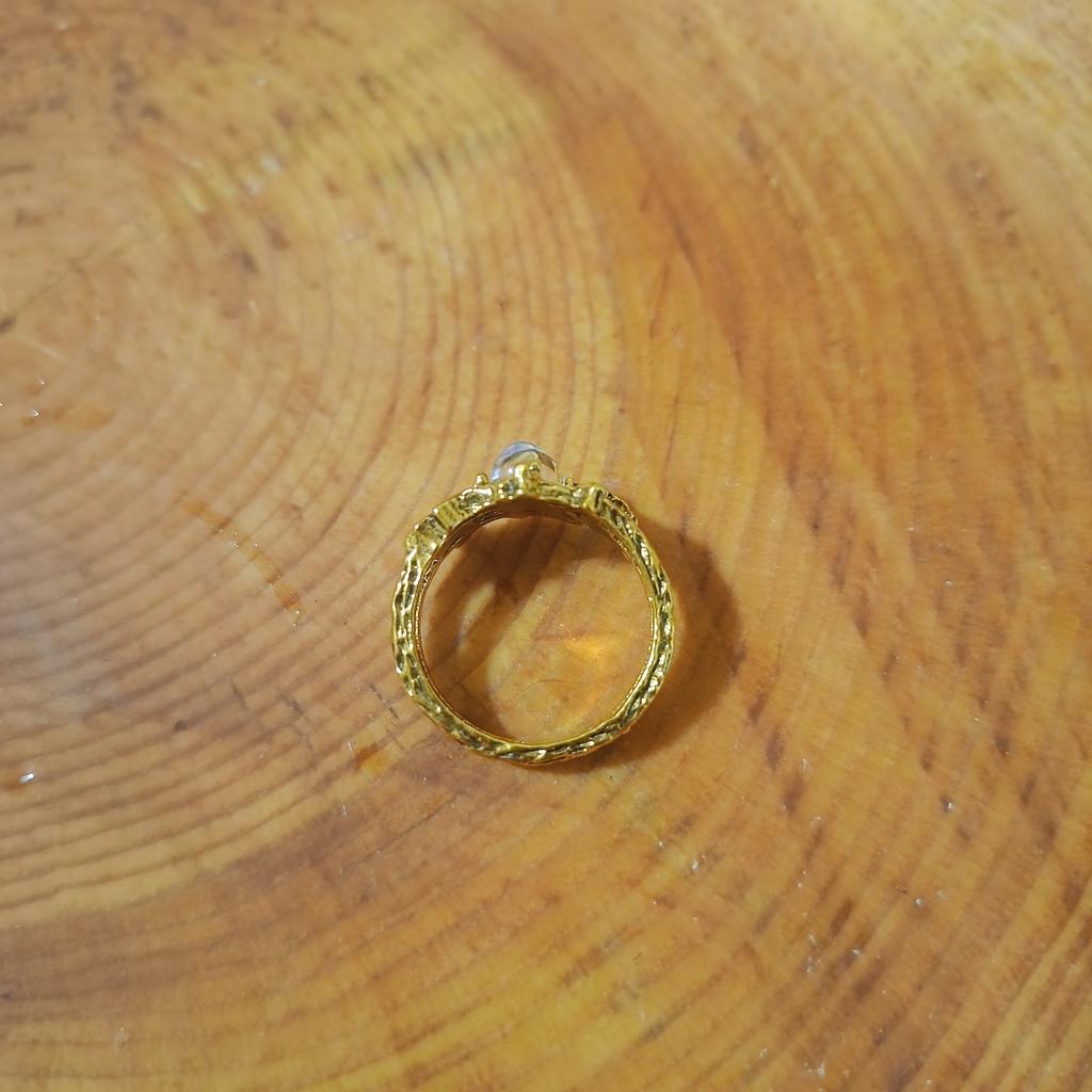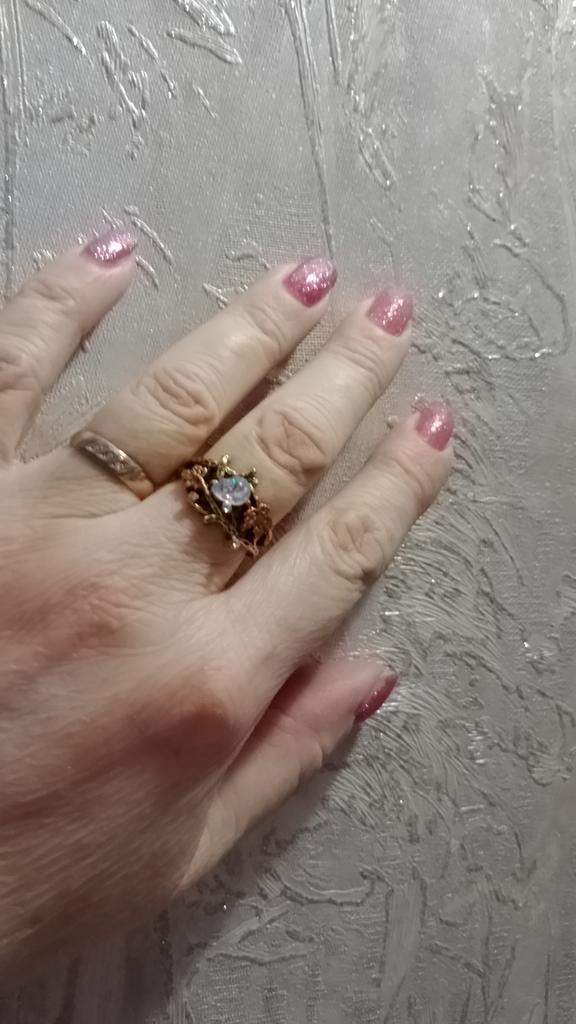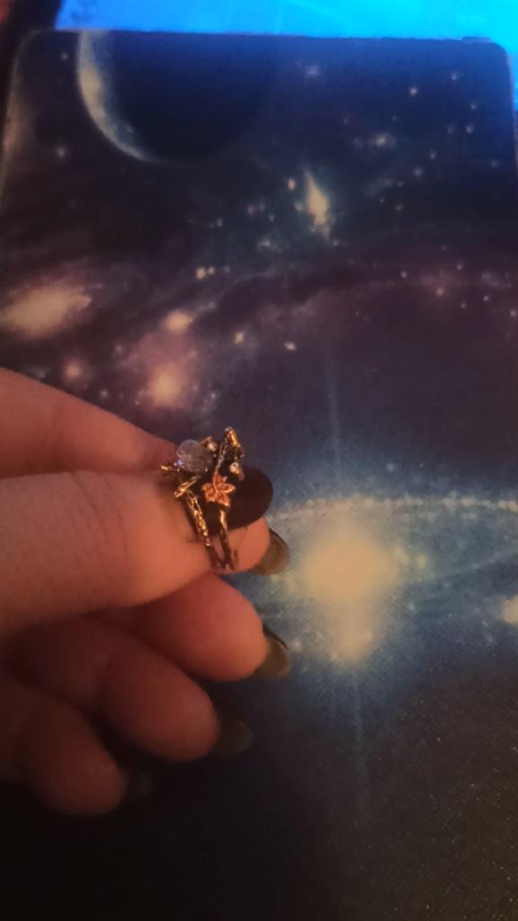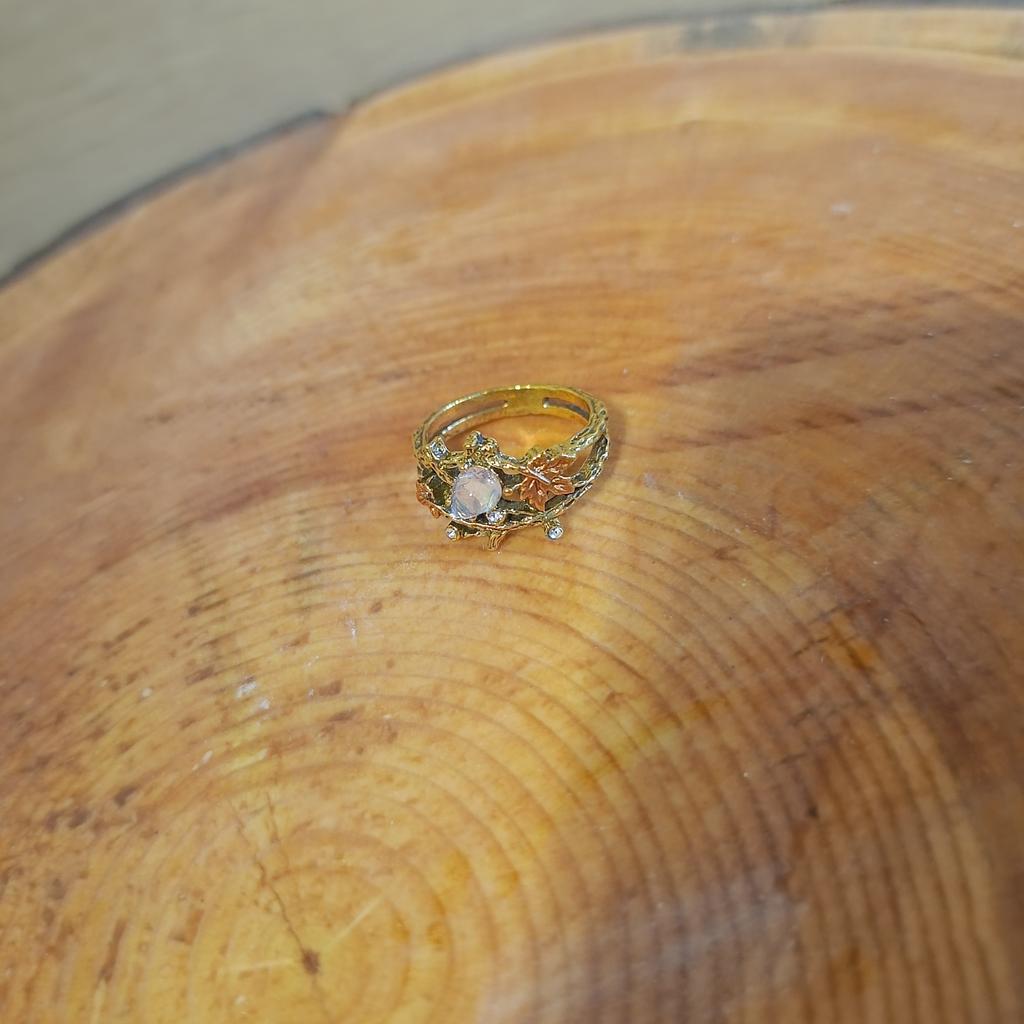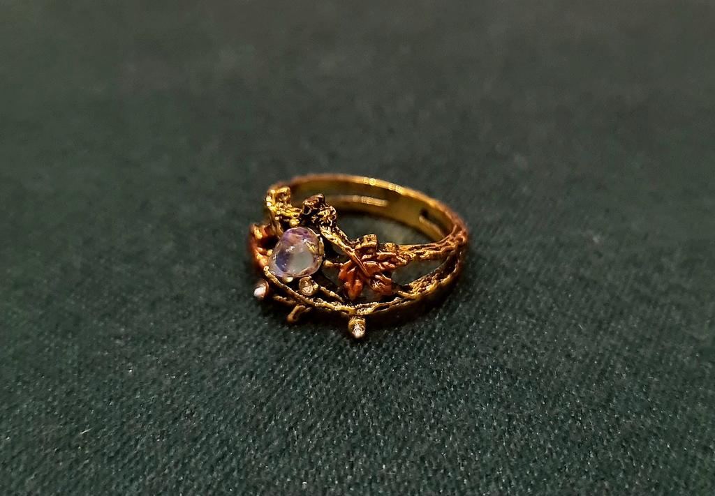 In the photo, the ring is made of a dark material imitating twigs. The ring that arrived is made of light metal, the leaves are small, the stone is not moonstone, but just glass. It would be better to have honest photos. Why invite so much negativity upon yourself for deception?