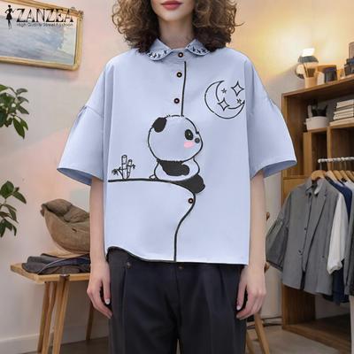 ZANZEA Women Turn Down Collar Loose Short Sleeve Print Blouse
