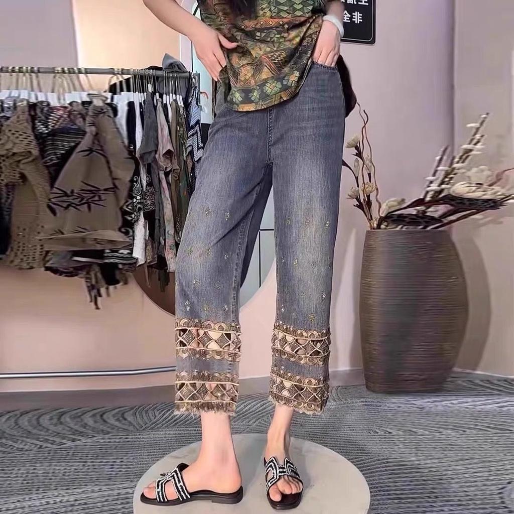 Hollowed Out Embroidered Straight Jeans Pants Female 2025 Summer High Waist Casual Denim Pants Fashion Cropped Pants