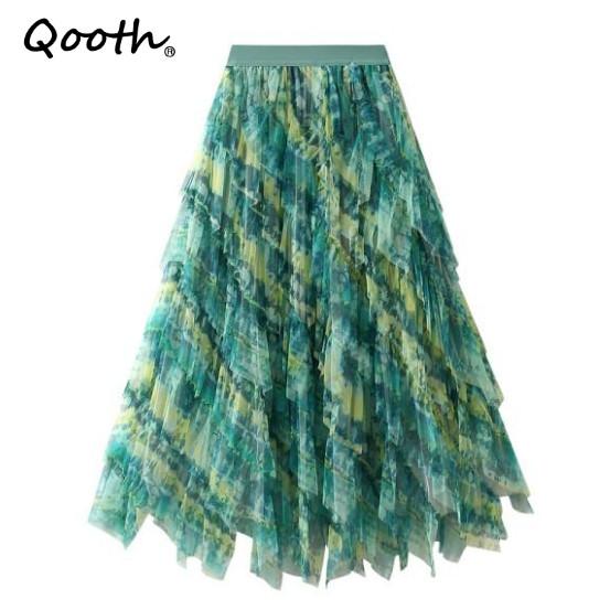 Qooth Colorful Pleated Irregular Mesh Half Skirt Mid-Length Rainbow Gauze Skirt Women Slim Skirt QT2614