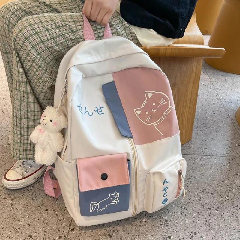 Korean Cute Cartoon Cat Women's Backpack Junior High School Students Schoolbag Large Capacity Nylon Waterproof Travel Backpack