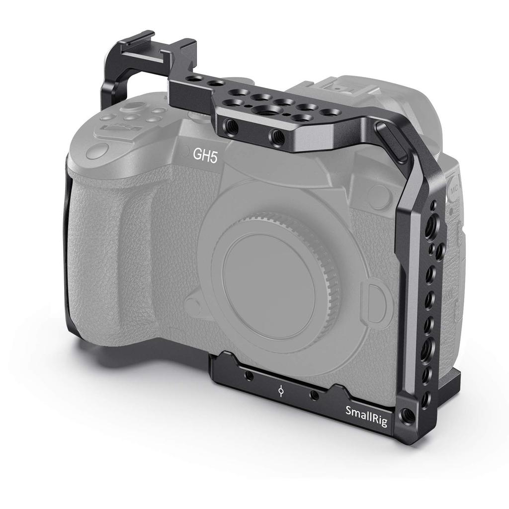 ① This cage is designed for the GH5. ② This cage is specifically designed for the GH5. It offers various mounting holes, allowing for mounting a wide range of accessories. ③ This cage fits perfectly around the camera, allowing unobstructed access to the SD card slot, battery compartment, and all camera controls. ④ The cage also features an array of 1/4" threaded holes on top, allowing for the attachment of a top handle like the SmallRig Top Handle 1984/1638. ① The integrated cold shoe on the top allows for the attachment of a microphone or accessories with a cold shoe adapter. ② You can also connect the SmallRig GH5 DMW-XLR1 Helmet Kit 2017 to the top of the cage for handheld shooting and XLR protection. ③ The cage can be mounted with the SmallRig Cold Shoe 1241, and the 1/4" and M2.5 threaded holes allow for the attachment of microphones, LED lights, etc. Recommended rig: "SmalRig Cold Shoe 1241" ① There are many 1/4 and 3/8 screw holes on the bottom, Vinten Quick Plate,