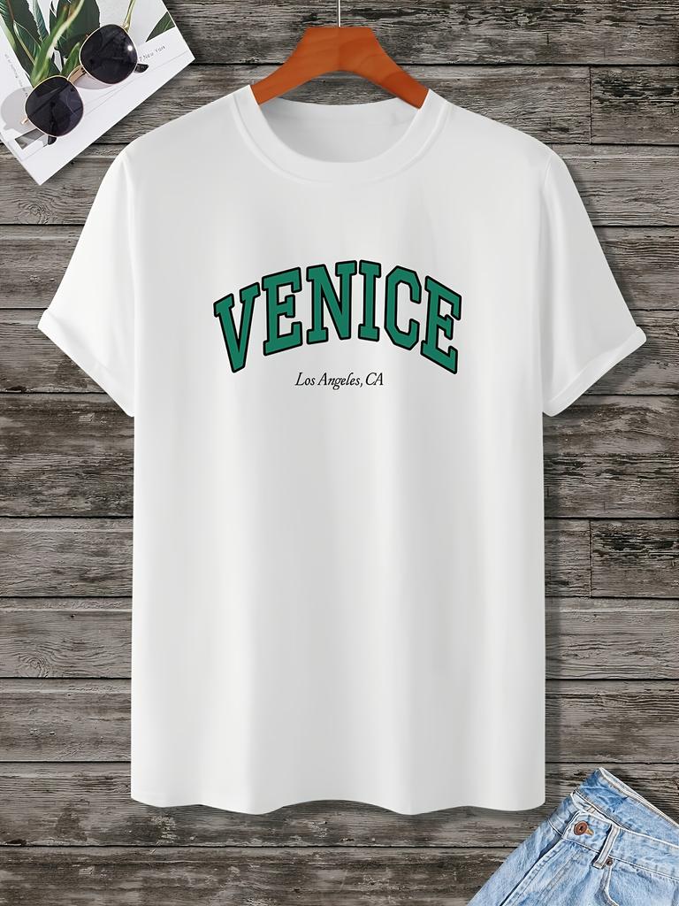 New Men's Casual Loose Fashionable White Crew Neck Letter 'Venice' Print Short Sleeves T-Shirt