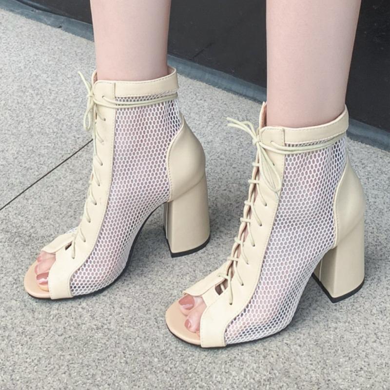 Peep Toe Ankle Boots Women Block High Heels Mesh Black 2025 New Summer Shoes Lace-up Jazz Party Dance Boots Breathable Summer