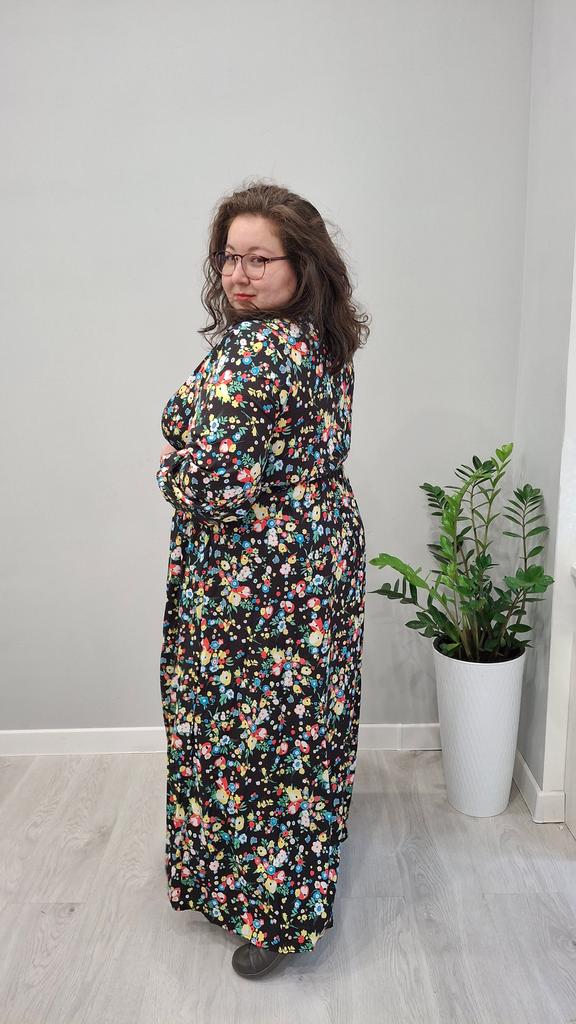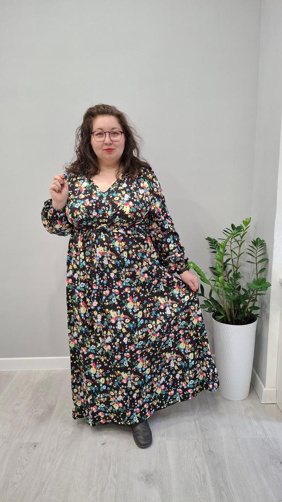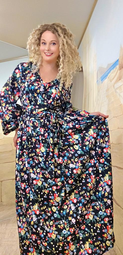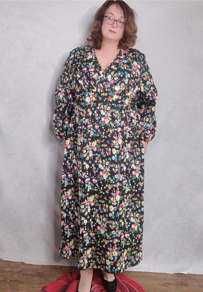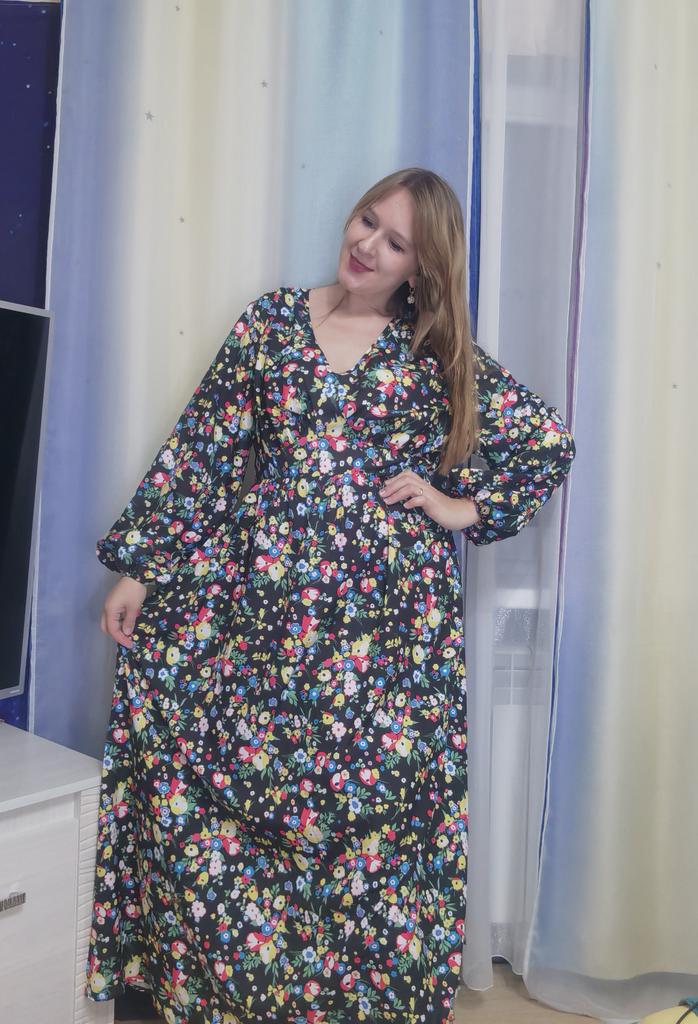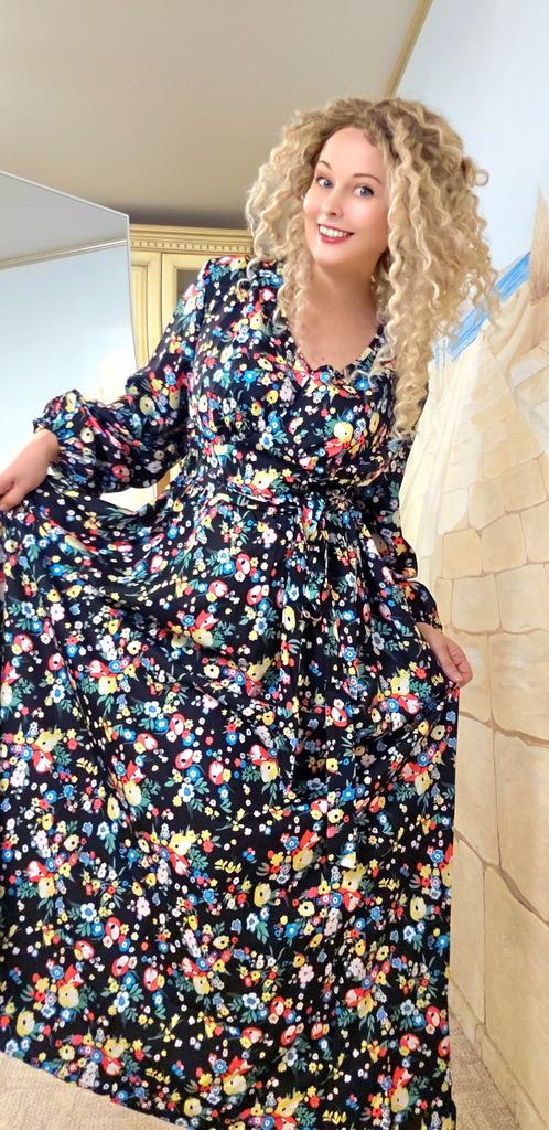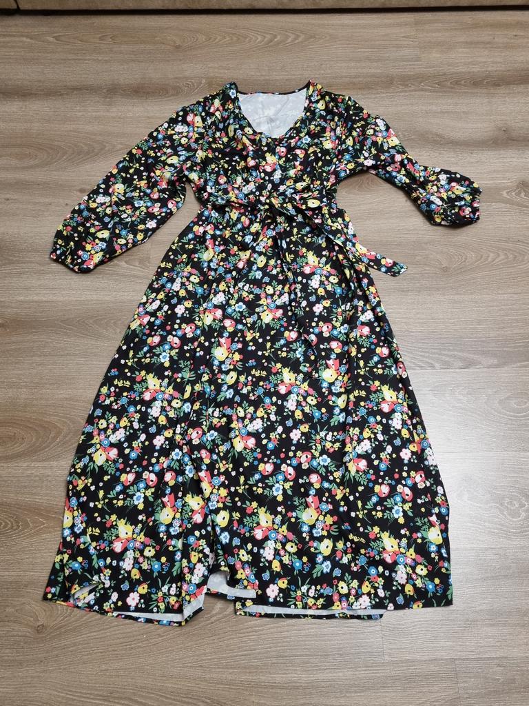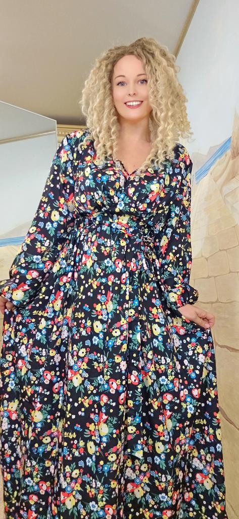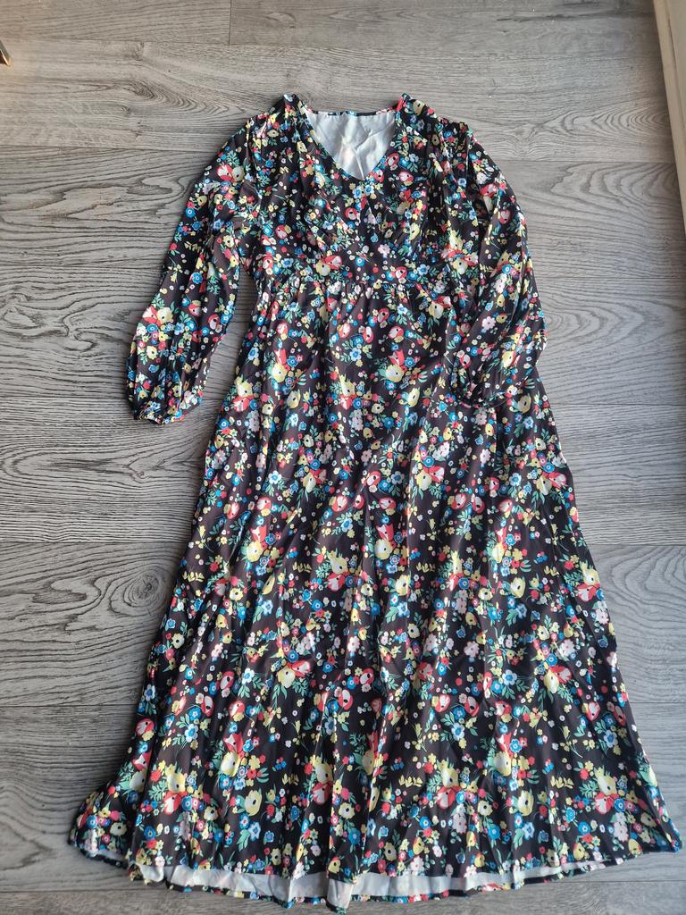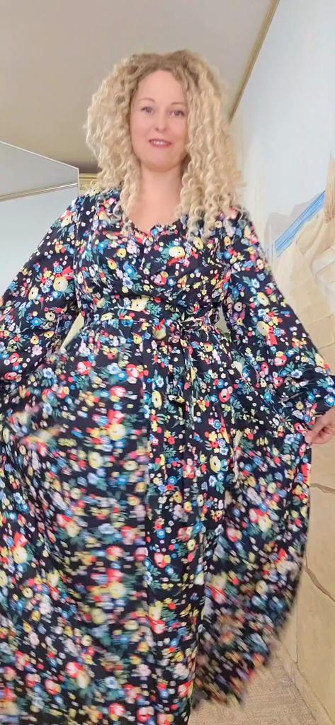 Super cool maxi dress with lovely flower pattern.It comes in 1 colour and few plus sizes.i am wearing xl on 103cm chest and 80cm waist,it fits perfectly,slightly big but with the belts it looks ok.The dress has long puffed sleeves,v-neck,great quality.Delivery took 3 weeks to Ireland.Happy Shopping!
