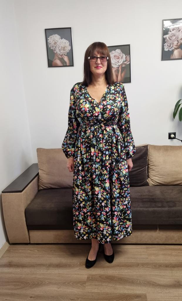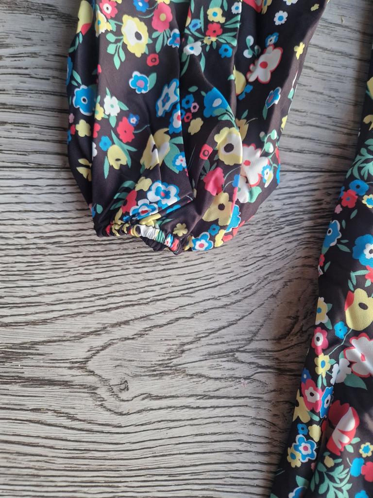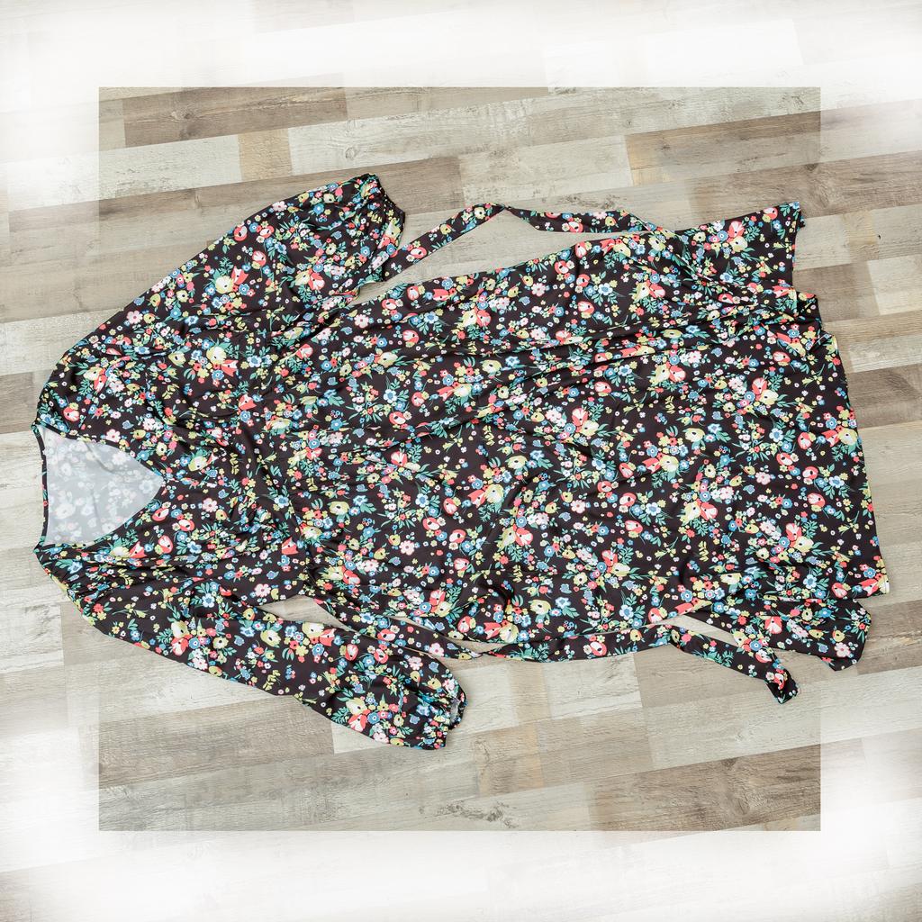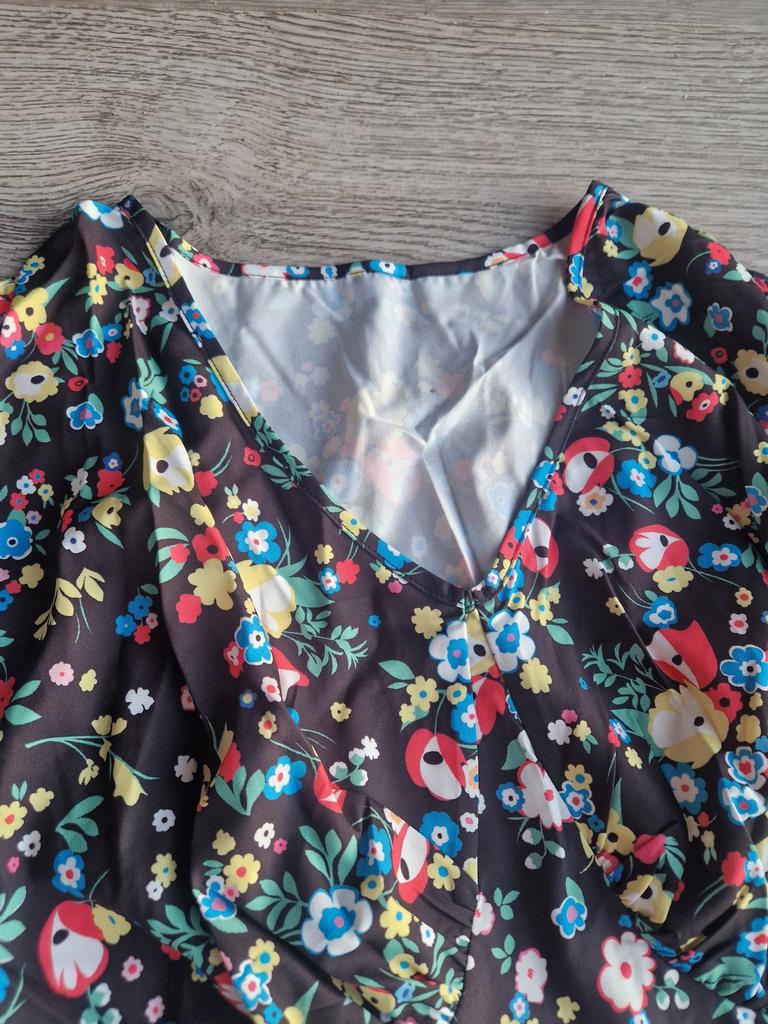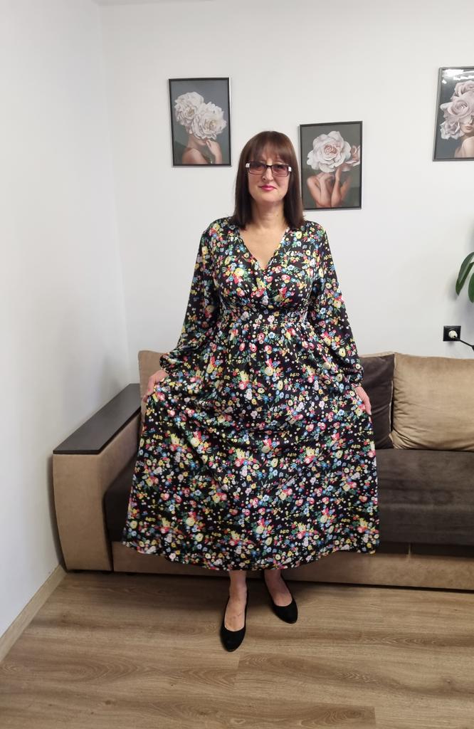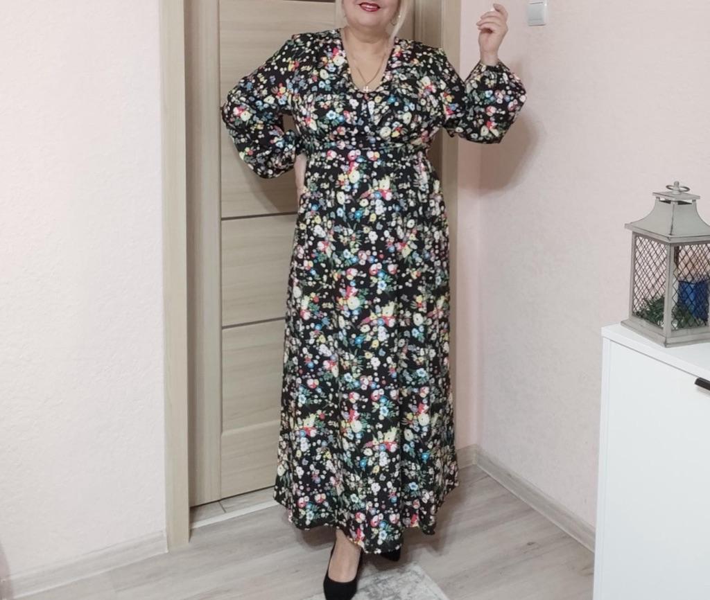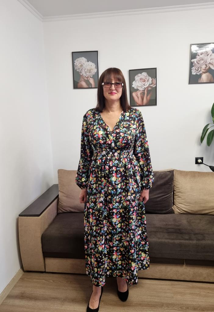 Super cool maxi dress with lovely flower pattern.It comes in 1 colour and few plus sizes.i am wearing xl on 103cm chest and 80cm waist,it fits perfectly,slightly big but with the belts it looks ok.The dress has long puffed sleeves,v-neck,great quality.Delivery took 3 weeks to Ireland.Happy Shopping!