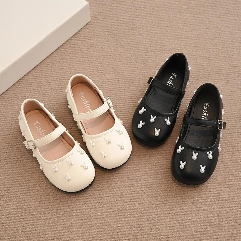 Children Flat Shoes with Sweet Rabbits Kids Princess Shoes Non-slip Soft Sole 2025 New Fashion Girls Leather Shoes Round Toes