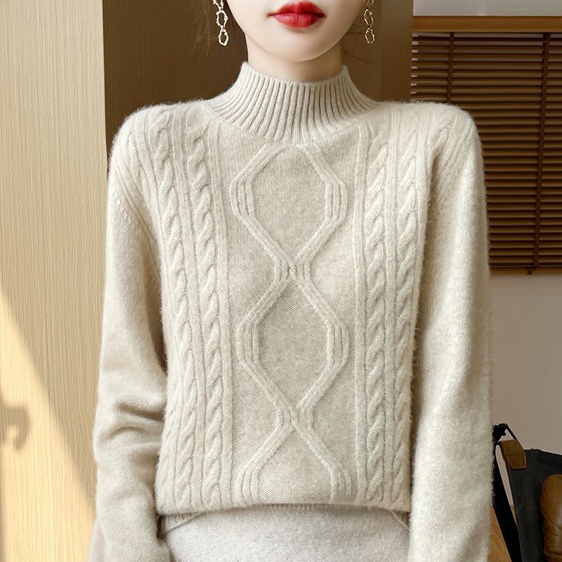 Women's Winter Thick Pure Wool Sweater - Half-Turtleneck High Neck Pullover, H-Silhouette Regular Fit with Flared Hem, Medium Stretch Long Sleeve