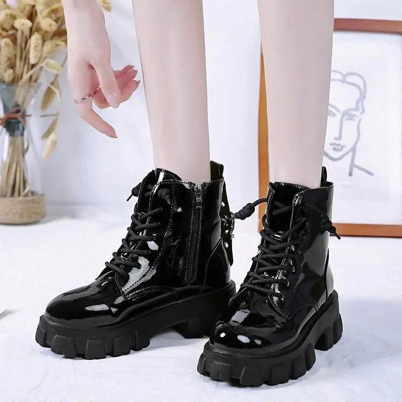 Round Toe Med Heel Boots Women Shoes Autumn Boots-women Booties Ladies Lace Up Luxury Designer Lolita Black 2025 Rubber Flat