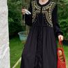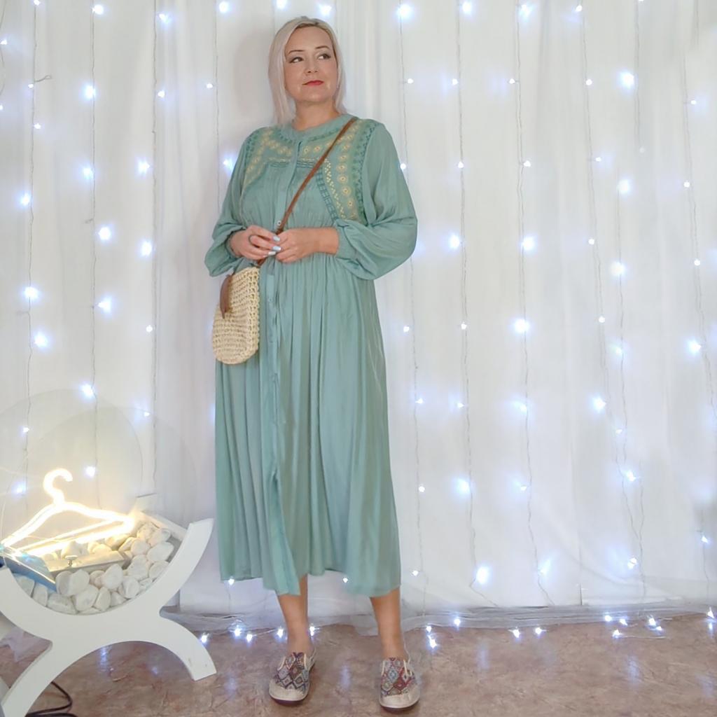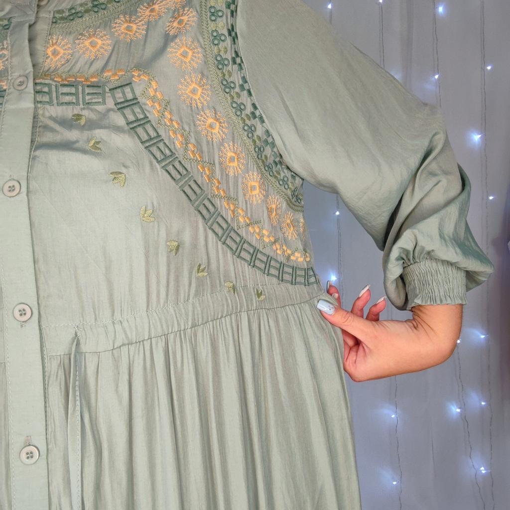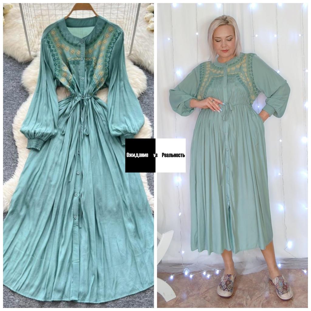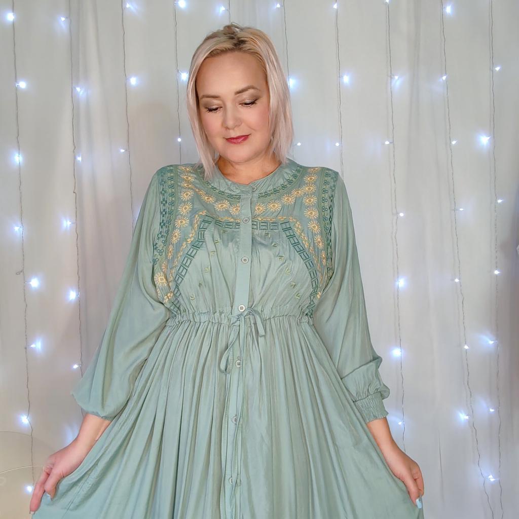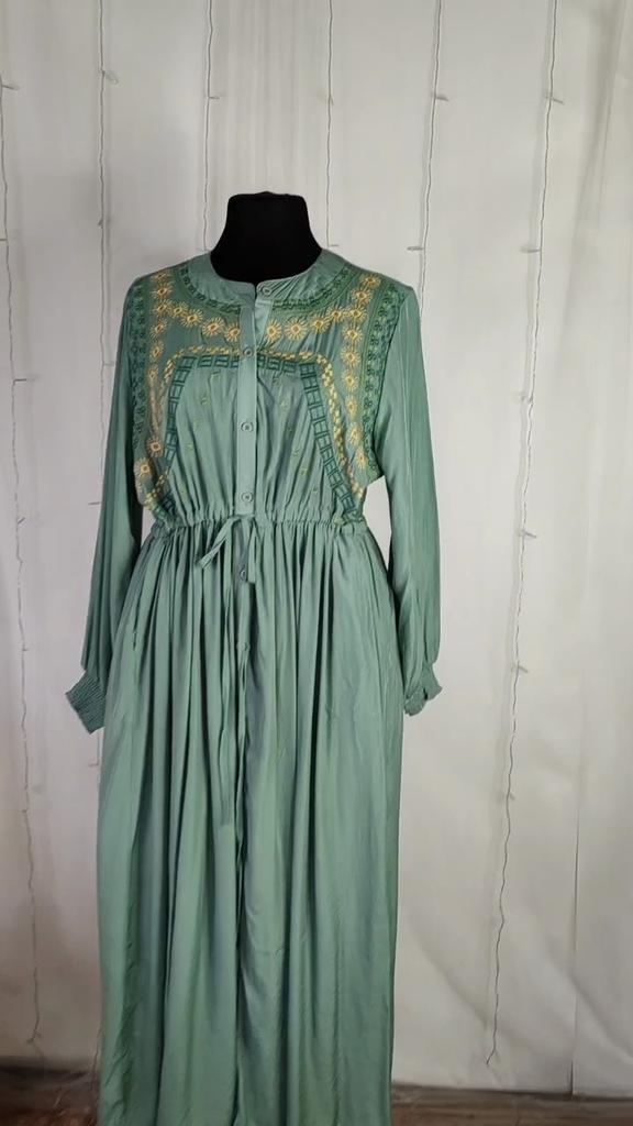 Vintage Long Sleeve Green Robe Autumn New O Neck Embroidery Party Dresses Waist Drawstring Design Straight Clothing