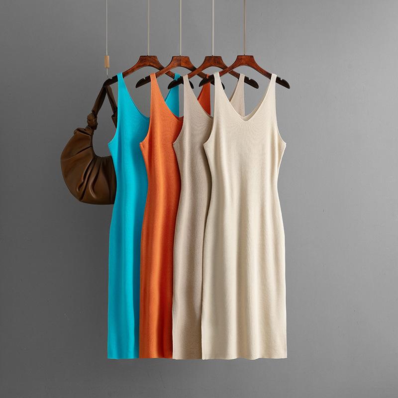 Women's Summer Thin Camisole Dress V-neck Sleeveless Vest Skirt With Slit Bottom Knit Skirt