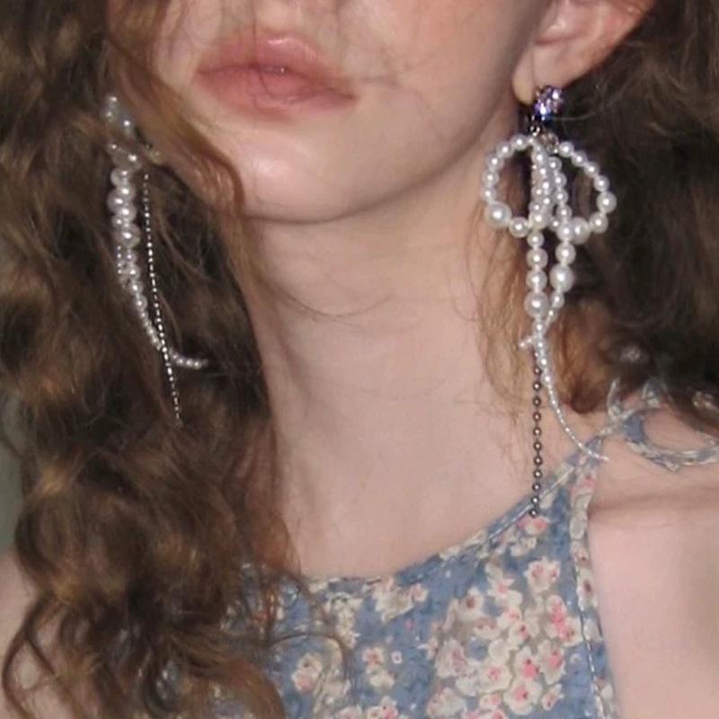 French Retro Pearl Bow Tassel Dangle Earrings For Women Elegant Tassel Jewelry Party Gifts