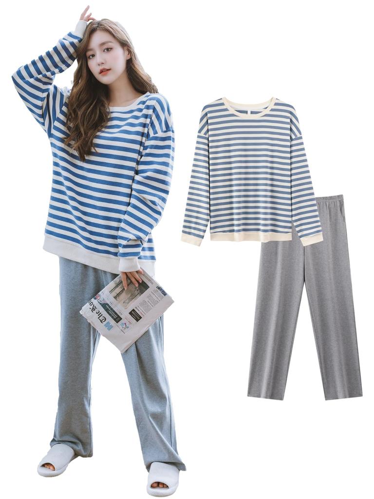 Beatgos Cotton Long Sleeve Cute Set Size Women's 100% Pajamas, Loungewear, (2036 Blue, L)