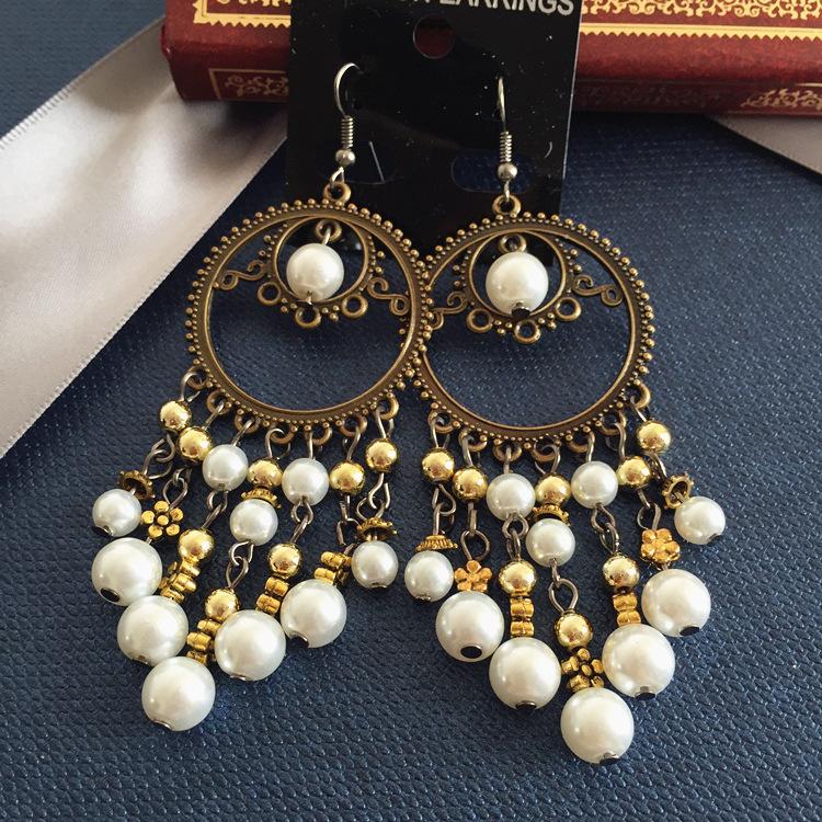 Vintage Celebrity Earrings Fashion Exaggerated Bohemian Tassel Pearl Bronze Long Beaded Earrings