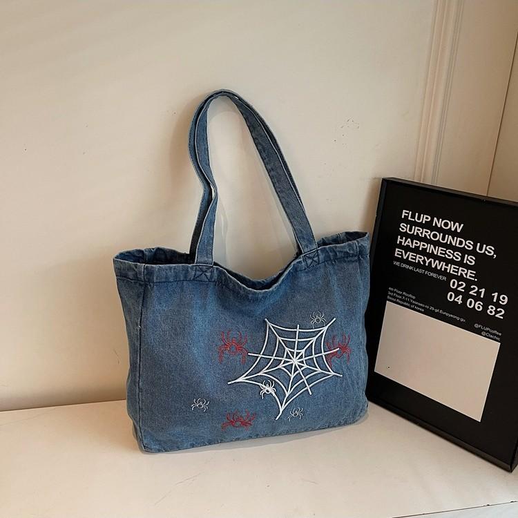 Vintage Gothic Anime Spider Web Printed Denim Bag Casual Commuter Large Capacity Shoulder Oblique Span Bag