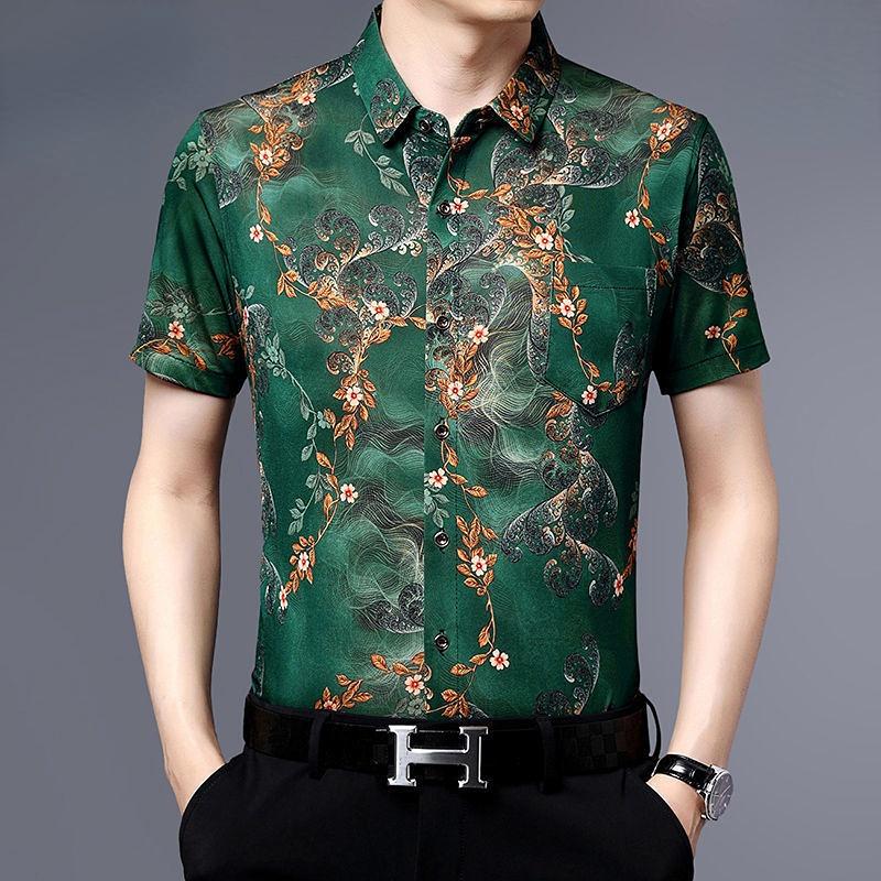 Y2k Vintage Men Summer Short Sleeve Floral Shirt Fashion New Printed Button Lapel Male Clothes Casual Loose Ice Silk Tops 2023