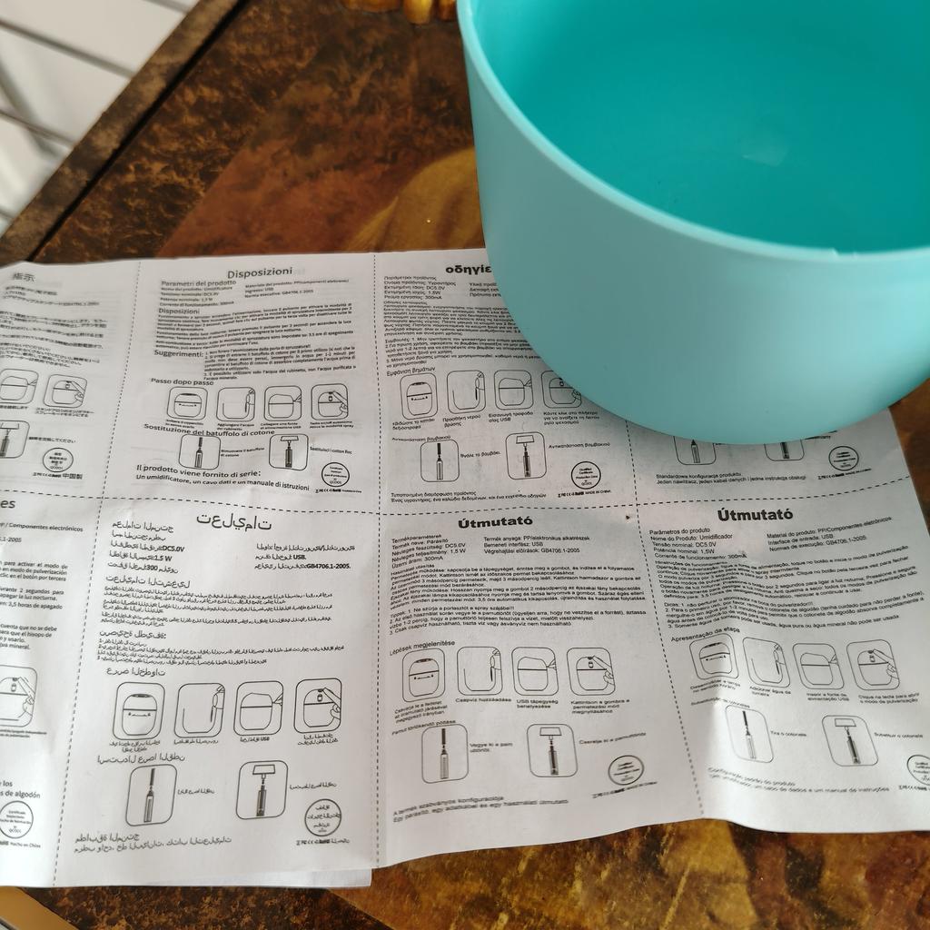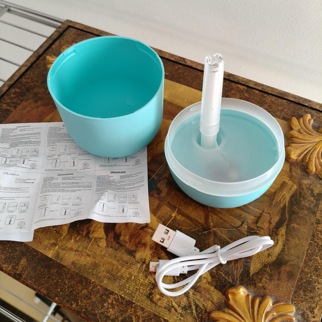 DIFFUSER medium-sized essential oil diffuser, arrived in Italy in 20 days with tracked shipping. Packaging in bubble wrap envelope. No box. Available in 3 colors You will find the cable and the instruction sheet. In reality, the operation is very simple, Power button on the top During operation the LED changes color continuously. Very beautiful ๐ . Recommended purchase ๐