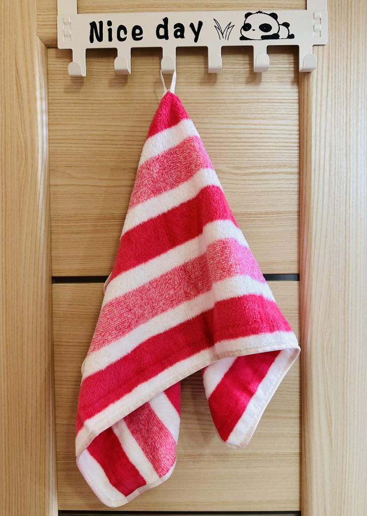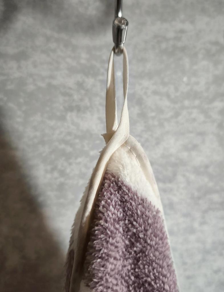 I ordered two towels, one arrived properly packaged, the other was crumpled and just lay in the postal bag. Soft, absorbency is average, has a loop for a hook.