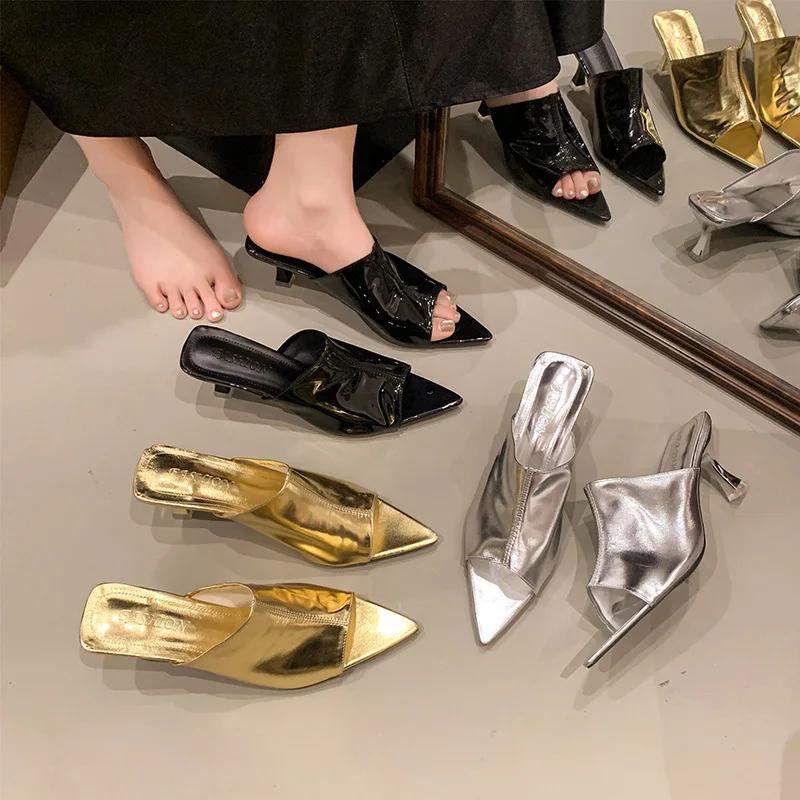 Female Shoes Gold Sandals Slippers Heels Pointed Toe Slides Low 2025 High Thin Rome PU Rubber Fabric Hoof Shoes Woman 2025