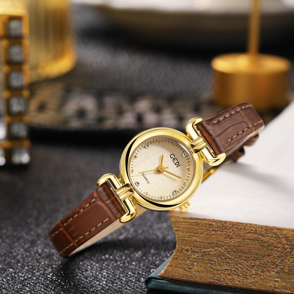 Gedi Retro-Style Women's Thin Quartz Watch with Cloth Pattern and Genuine Leather Strap