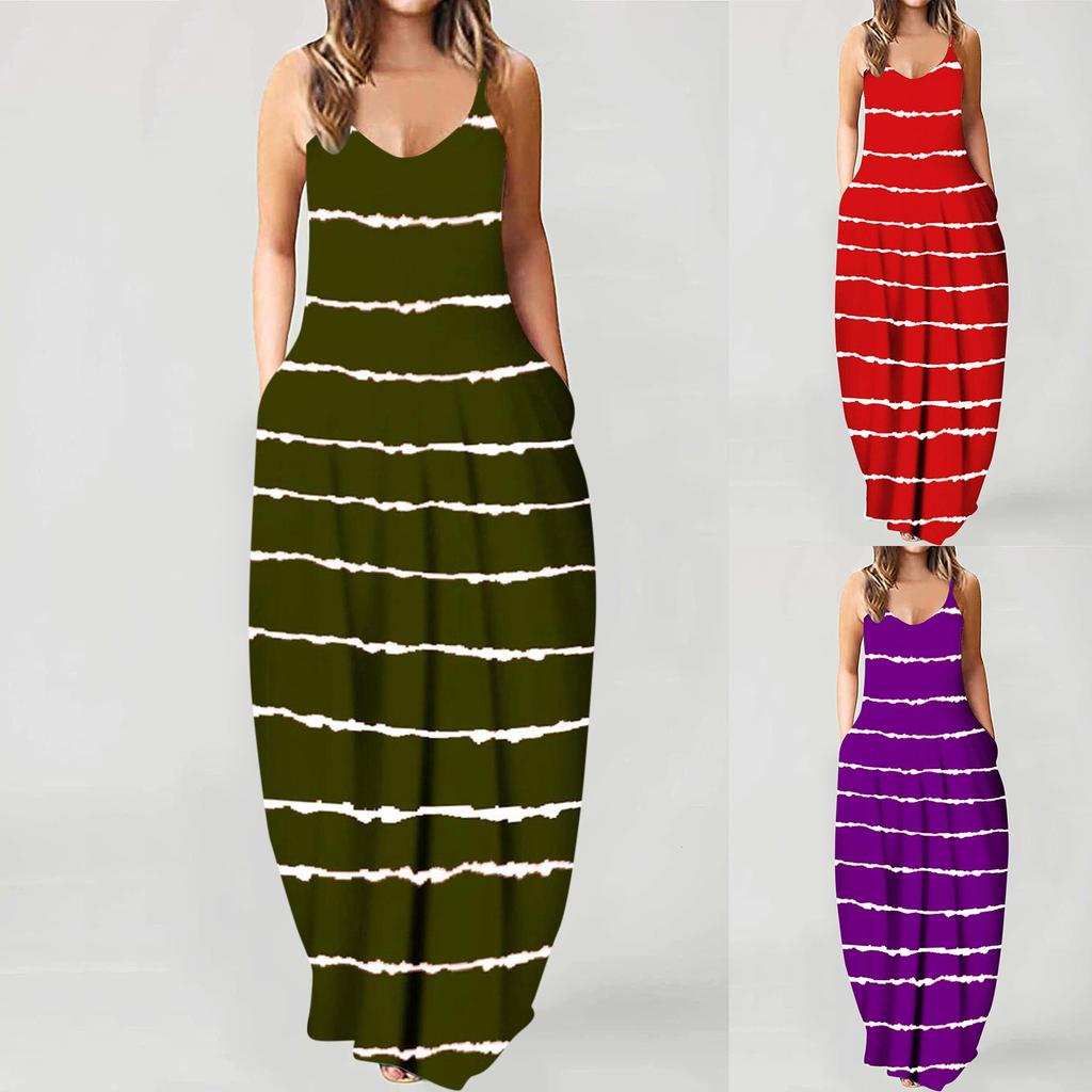 Fashion Women's Loose Casual Summer Striped Print Pocket Sling Sleeveless Dress
