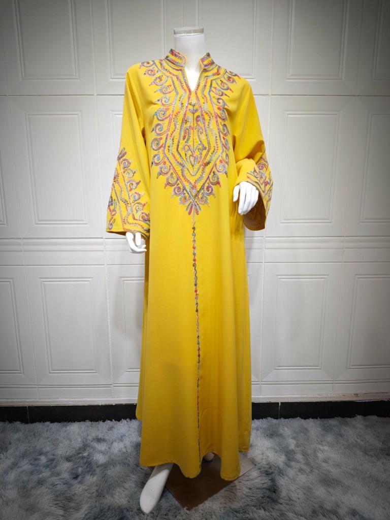 This elegant Middle Eastern pullover robe is designed with refined craftsmanship, featuring intricate embroidery that adds a touch of sophistication to its traditional Arabic Jalabiya style. Constructed from high-quality polyester, it offers a smooth and comfortable fit. The robe is accentuated by its high-density ice silk wrinkle material, which provides a luxurious feel and a graceful drape, ensuring both style and comfort for any occasion.