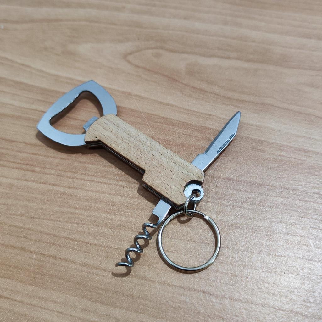 Multi-opener: 1. Corkscrew 2. Bottle opener 3. Can opener Very comfortable. pretty. Made of stainless steel and wood. I recommend 🤗