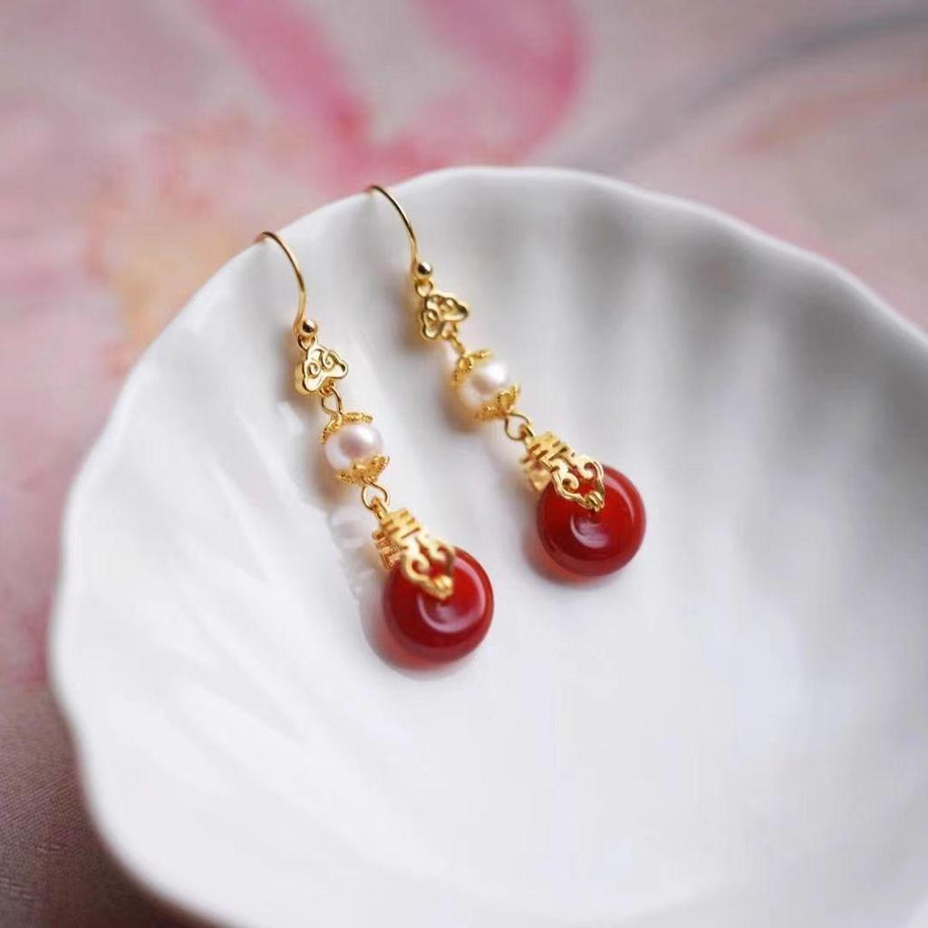 2024 Double Happiness Pearl Earrings: Hanfu Wedding Accessories In Ancient Style with Spring Ear Clips