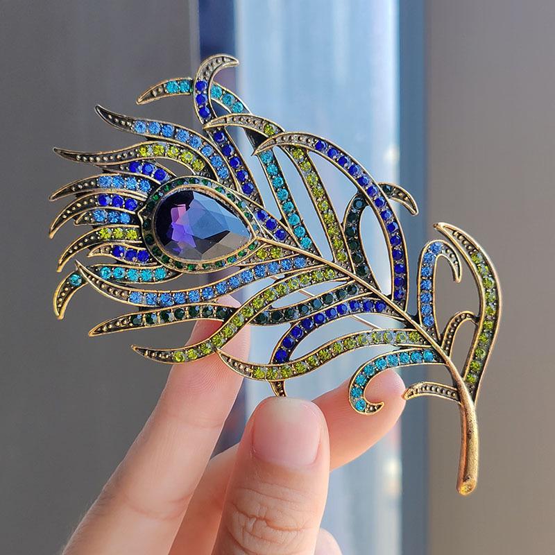 Elegant Colorful Peacock Feather Brooch with Rhinestones – Vintage Alloy Design for Men & Women