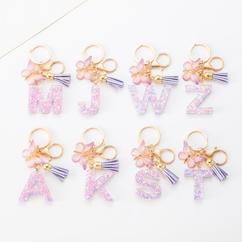 A-Z Resin Letter Keychain with Purple Butterfly Tassel Pendant for Women's Bags