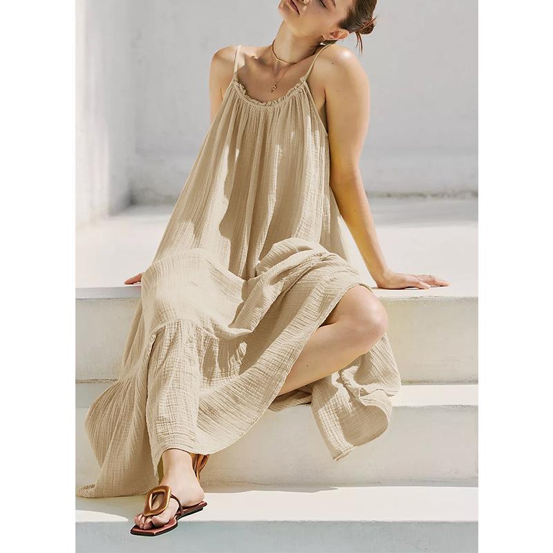 Experience the charm and elegance of this beautifully designed mid-length cotton camisole dress, ideal for a warm summer day. Crafted from textured, skin-friendly cotton, this dress offers both comfort and style. Its versatile design makes it perfect for various occasions, while the delightful frill detail adds a touch of retro French flair. Whether you're enjoying a casual tea break or attending a garden party, this dress is a delightful addition to your summer wardrobe.