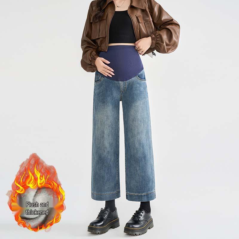 Experience comfort and style during pregnancy with these maternity jeans, designed specifically for the autumn and winter seasons. Crafted from premium denim, these loose straight-leg 9-point pants offer a slimming effect while providing optimal support for expecting mothers. The fleece lining ensures warmth, making them a perfect choice for colder weather. These jeans combine functionality with a modern design, ensuring you look chic while feeling comfortable throughout your pregnancy journey.