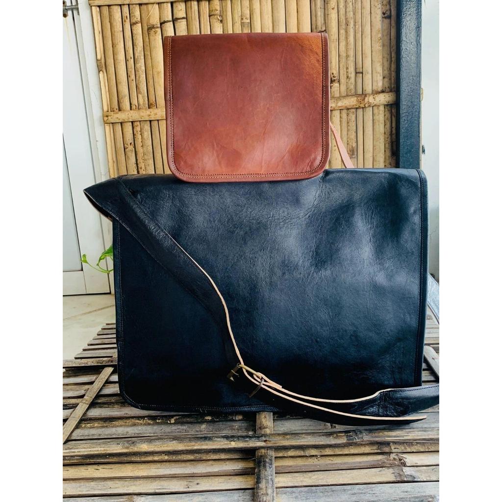 New Leather Vintage Black Messenger Shoulder Laptop Bag Briefcase (Free Sling Brown Bag Size - 9 X 7 X 3 In )