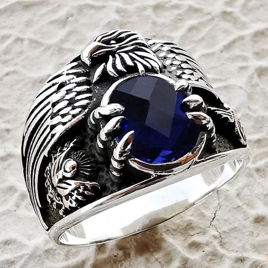 Luxury European and American Retro Trendy Men Domineering Inlaid with Blue Gemstone Rings, Punk Men's Eagle Wings Ring