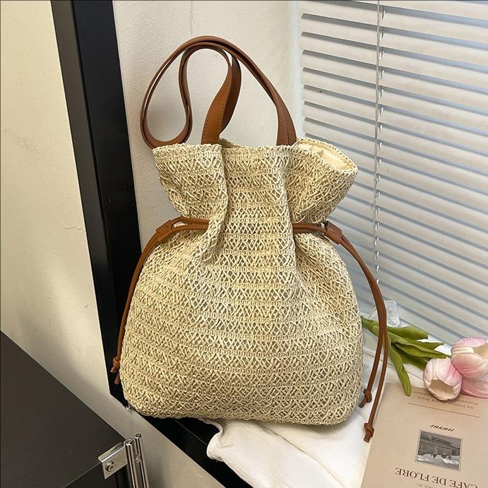 Casual Large-capacity Bag Women's New Drawstring Woven Seaside Vacation Beach Shoulder Bag