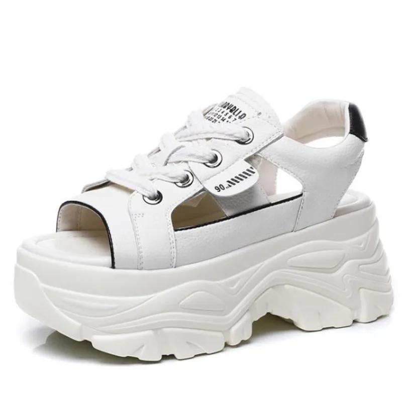 8cm Genuine Leathe Slippers Lace Up Hollow Multicolor Peep Toe Sandals Platform Wedge Ladies Women Summer White Slides Shoes