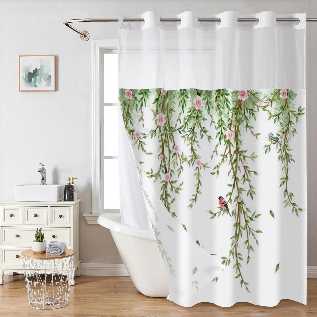 No Hook Floral with Birds Shower Curtain With Snap-in Fabric Liner, Sheer Top Window, Waterproof Double Layer Bathtub Curtain