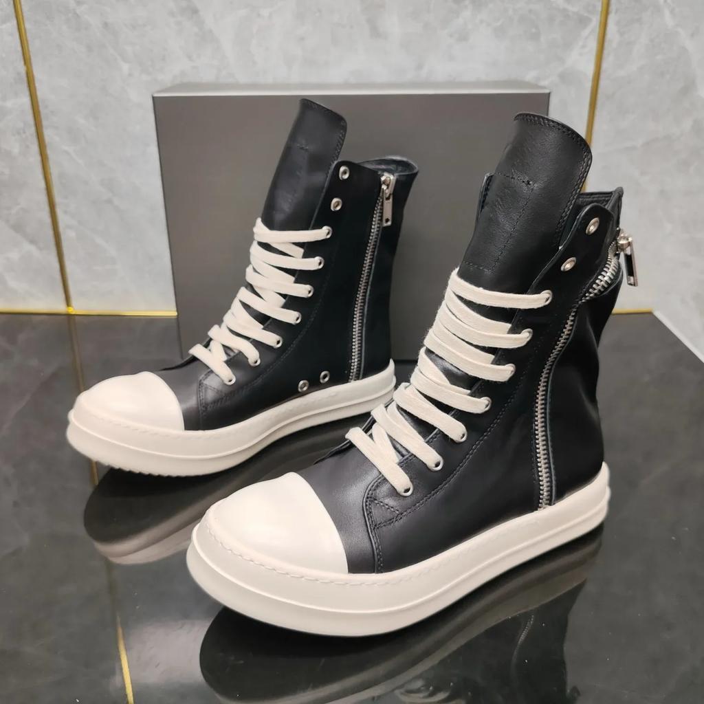 Top Quality Thick Bottom Black Cowhide Pocket High-top with Zipper Fashion Men's Shoes Women's Shoes Harajuku Style.