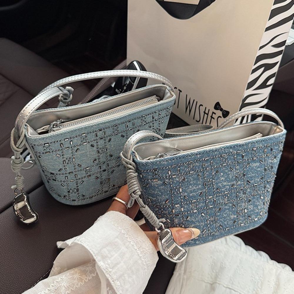 Light Luxury Sequined Small Bag Women's Shoulder Bucket Bag Denim Blue Chain Messenger Bag