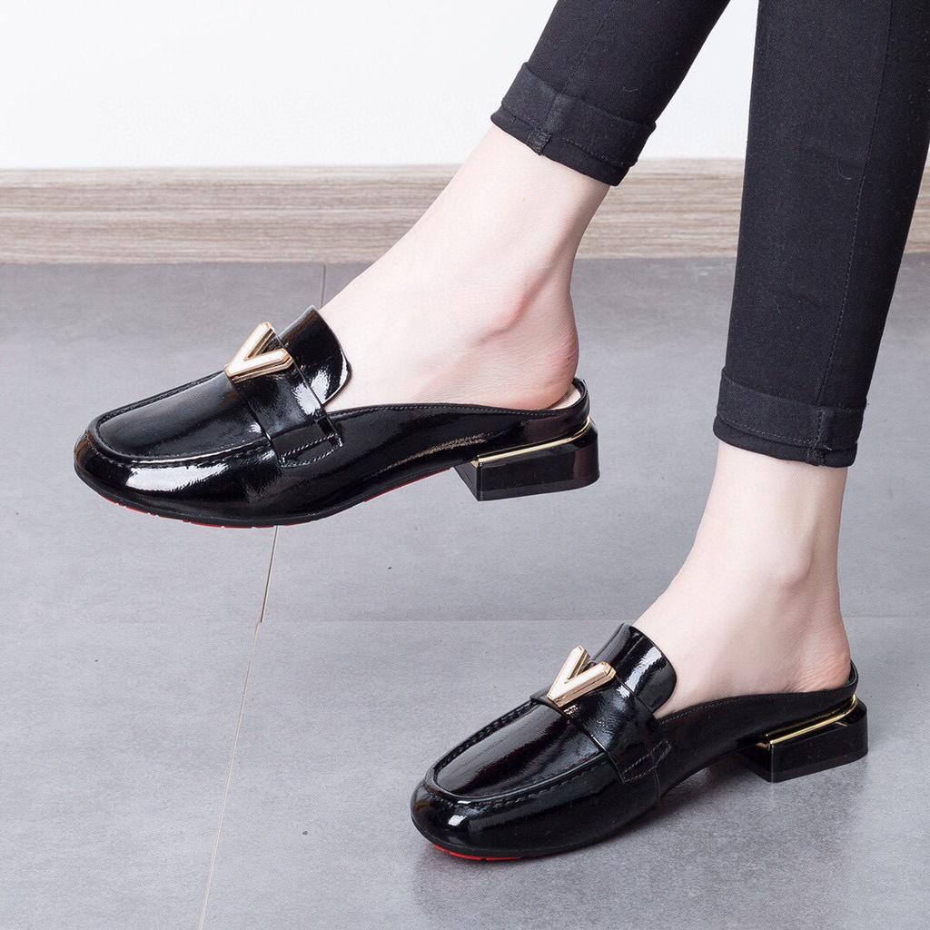 Baotou Wear Sandals Women's Cow Patent Leather Flat-bottomed Slippers Casual Women's Half Slippers