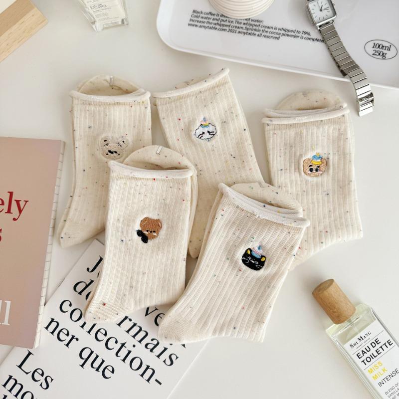 Female Spring and Autumn Trend Cartoon Dog Embroidery Idea Yarn Roll Edge In The Tube Pile Socks
