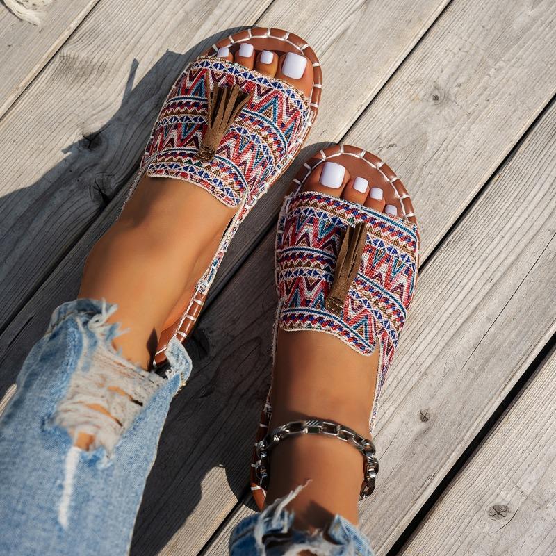 New Women's Fashion Slippers Round Toe Flat Sole Color Spelling Tassel Shoes Outdoor Beach Leisure Plus-size Zapatillas De Mujer