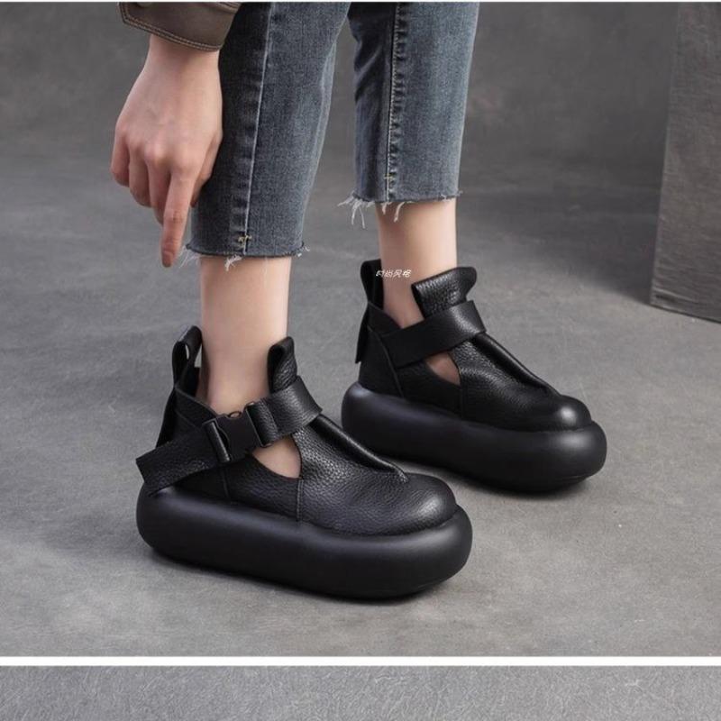 2025 New Women's Fashion Boots Round Toe Platform Sole Buckle Hollow Short Boots Retro All-match Spring and Autumn Single Shoes