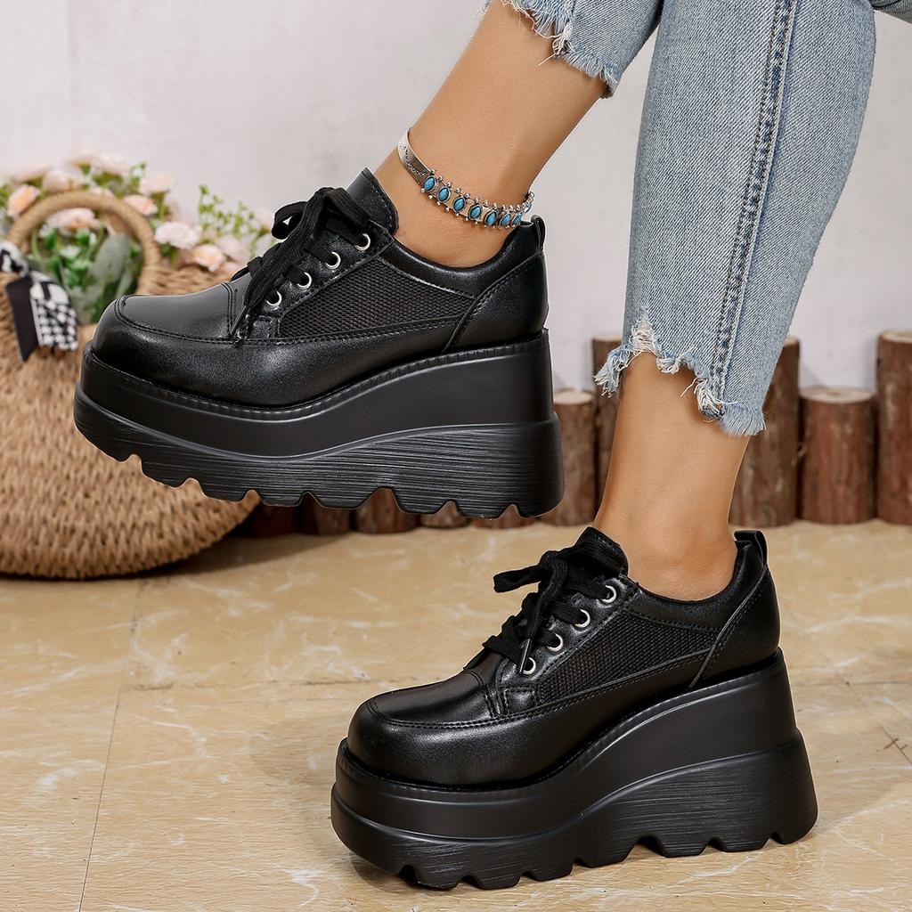 Casual Solid Black Super High Heel Loafer Women 2025 Autumn Chunky Platform Lace Up Pumps Thick Bottom Breathable Mesh Shoes