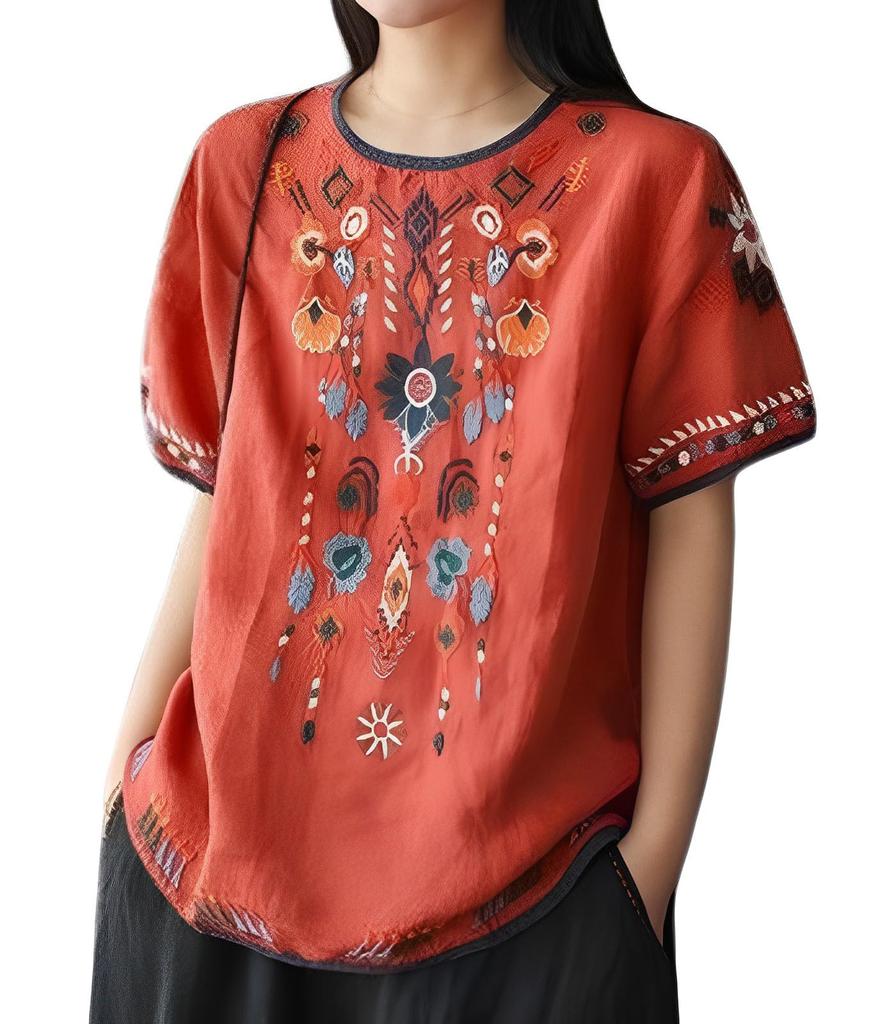 Second Roots Ethnic Embroidered Pullover Top with Asian Short Loose Casual Pattern, Sleeves, Summer, Women's, Relaxed, Natural, Resort, Beach,