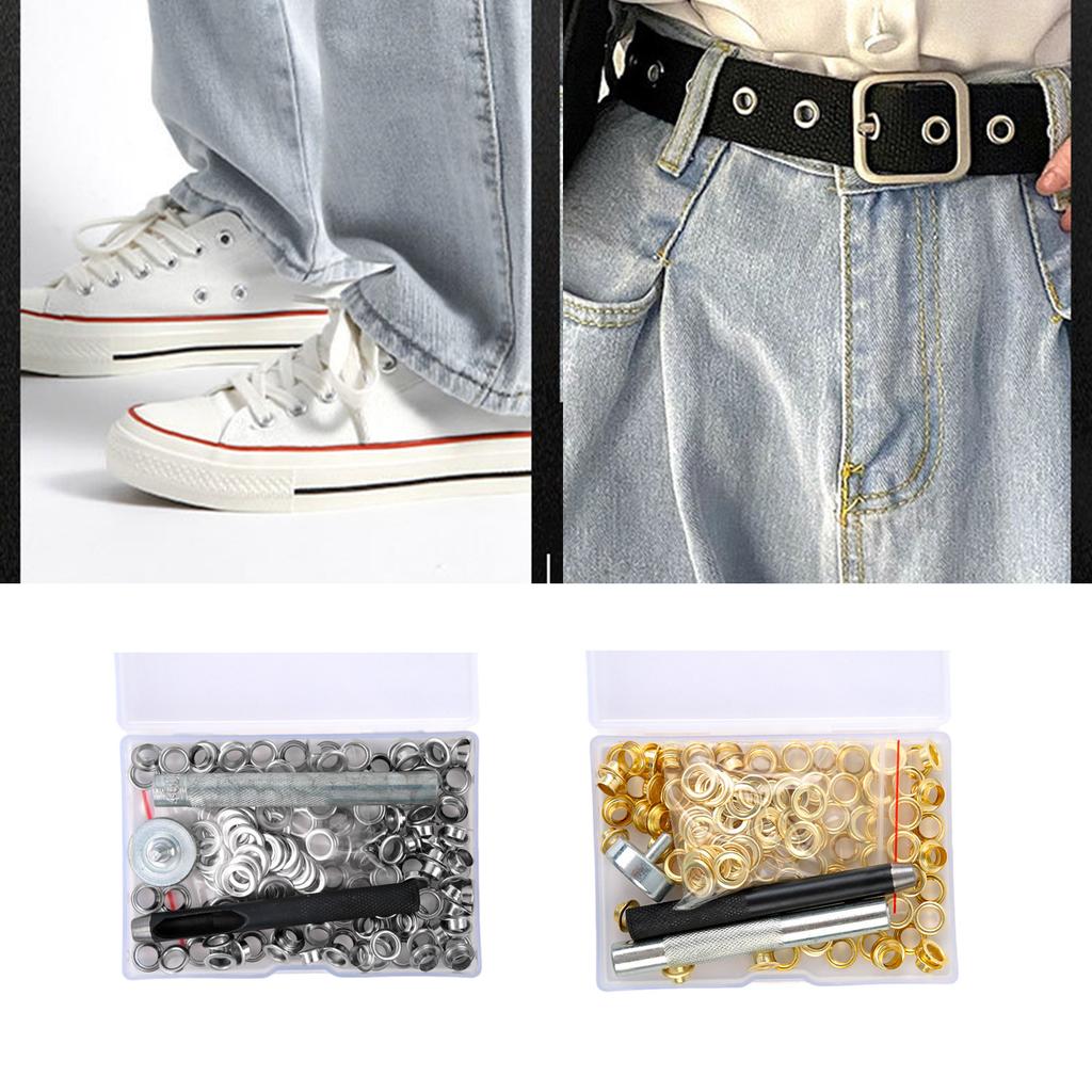 You will get 100 pieces 6mm/8mm/10mm Grommet Eyelets Assortment Kits with Setting Install Tool, Contains gold/silver/brass color grommet eyelets, including silver, golden, black, brass. Each set includes 1 eyelet and 1 washer. All packed in clear storage case.