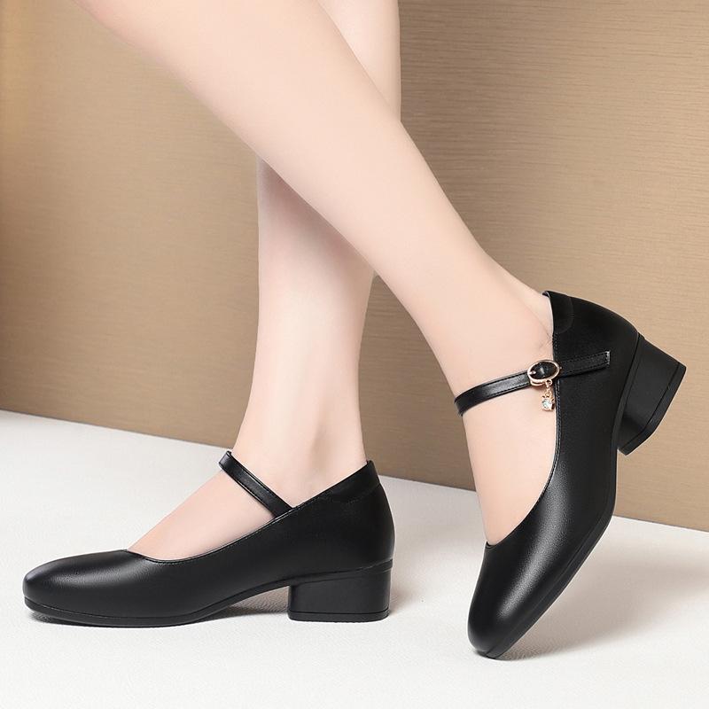 Single Shoes Women's Low Heels, Soft Leather Soft Sole Comfortable Women's Leather Shoes Round Head Thick Heel with Cheongsam One-button Women's Shoes