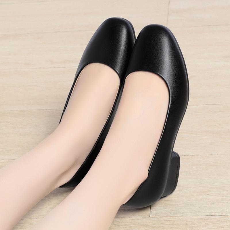 Single Shoes Women's Soft Leather Round Head Thick Heel Medium Heel Professional Women's Shoes Black Work Comfortable Women's Soft Sole Shoes