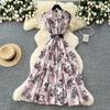 Summer Women Vintage Print Short Sleeve Turn-down Collar Single Breasted Long Midi Party Shirt Dresses with Belt