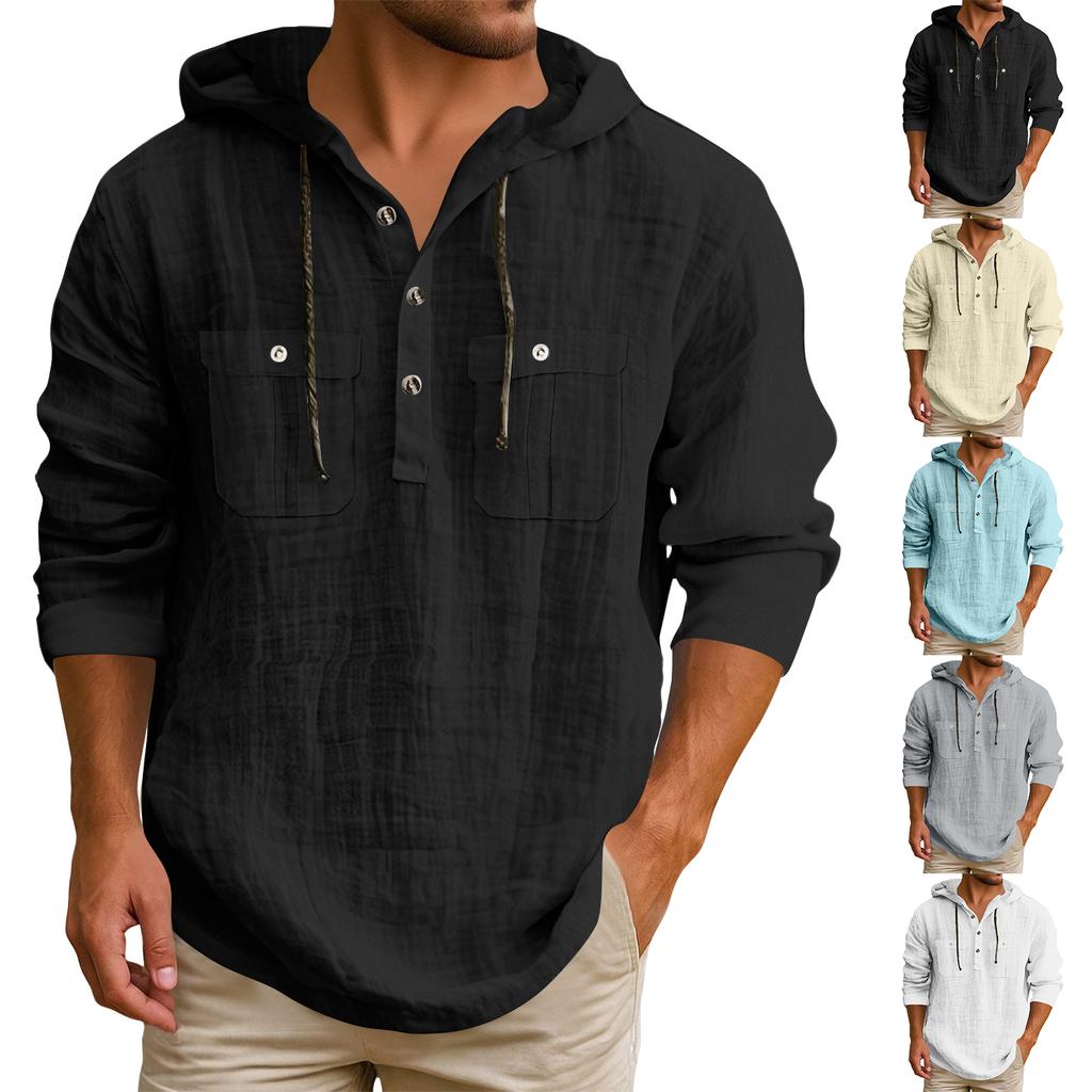 Men's Hooded T-shirt Solid Color Cotton And Linen Men's Casual Long-sleeved Top